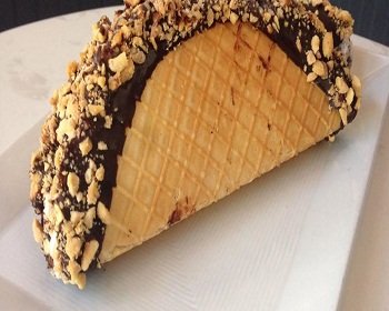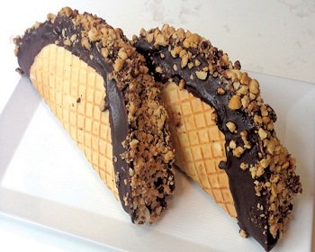 Yummy butterscotch ice cream coated with chocolate and topped with nuts.